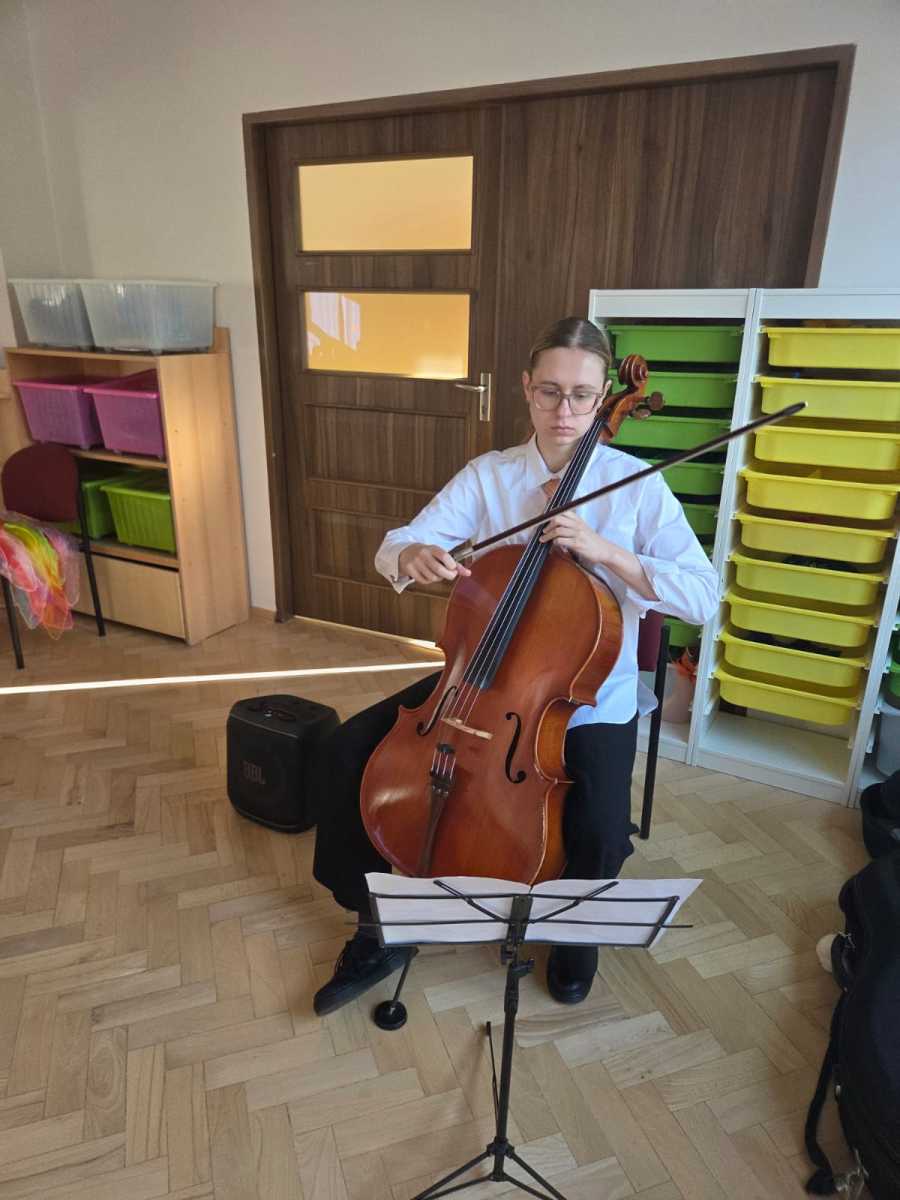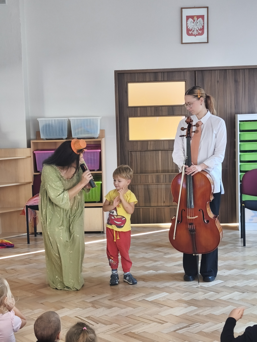 W październikowy poranek sala naszego przedszkola zamieniła się w kolorową, muzyczną krainę. Wszystko za sprawą niezwykłego koncertu pt. „Jesienna bajka z wiolonczelą”, który przeniósł dzieci w świat dźwięków, wyobraźni i jesiennych opowieści .Główną bohaterką wydarzenia była wiolonczela. To wyjątkowy instrument o głębokim, ciepłym brzmieniu, które doskonale oddaje nastrój jesiennej aury. Podczas koncertu dzieci miały okazję nie tylko posłuchać pięknych melodii, ale również poznać budowę instrumentu, zobaczyć, jak wydobywa się z niego dźwięk oraz dowiedzieć się wielu ciekawostek o jego historii. Koncert był połączeniem muzyki i opowieści. Barwna narracja prowadziła dzieci przez las pełen szeleszczących liści, które rozbudzały wyobraźnię najmłodszych. Muzyka dopełniała opowieść, wprowadzając atmosferę spokoju, zadumy, a czasem radości i tańca.