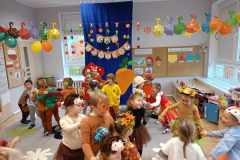 25 października 2023r. w naszym przedszkolu odbył się Bal Jesieni, który stał się naszą coroczną tradycją. Z okazji imprezy dzieci przyszły tego dnia do przedszkola ubrane w stroje i przebrania o tematyce jesiennej, które z dumą i uśmiechem na ustach prezentowały swoim rówieśnikom. Wspólnie bawiły się liski, jeżyki, sówki, jesienne wróżki. Nasze przedszkole mieniło się wszystkimi kolorami jesieni. Były barwne korowody, wężyki, kółka i kółeczka. Każda z grup przygotowała krótki występ artystyczny o tematyce jesiennej. Oprócz tańców w swoich salach dzieci aktywnie uczestniczyły w różnorodnych zabawach: wykonywały jesienne liście, rozwiązywały zagadki i uczestniczyły w konkursach o jesieni. Dużo radości sprawiło również polisensoryczne rozpoznawanie darów jesieni. Mali, jesienni przebierańcy bawili się doskonale, czego dowodem były uśmiechy na ich twarzach.