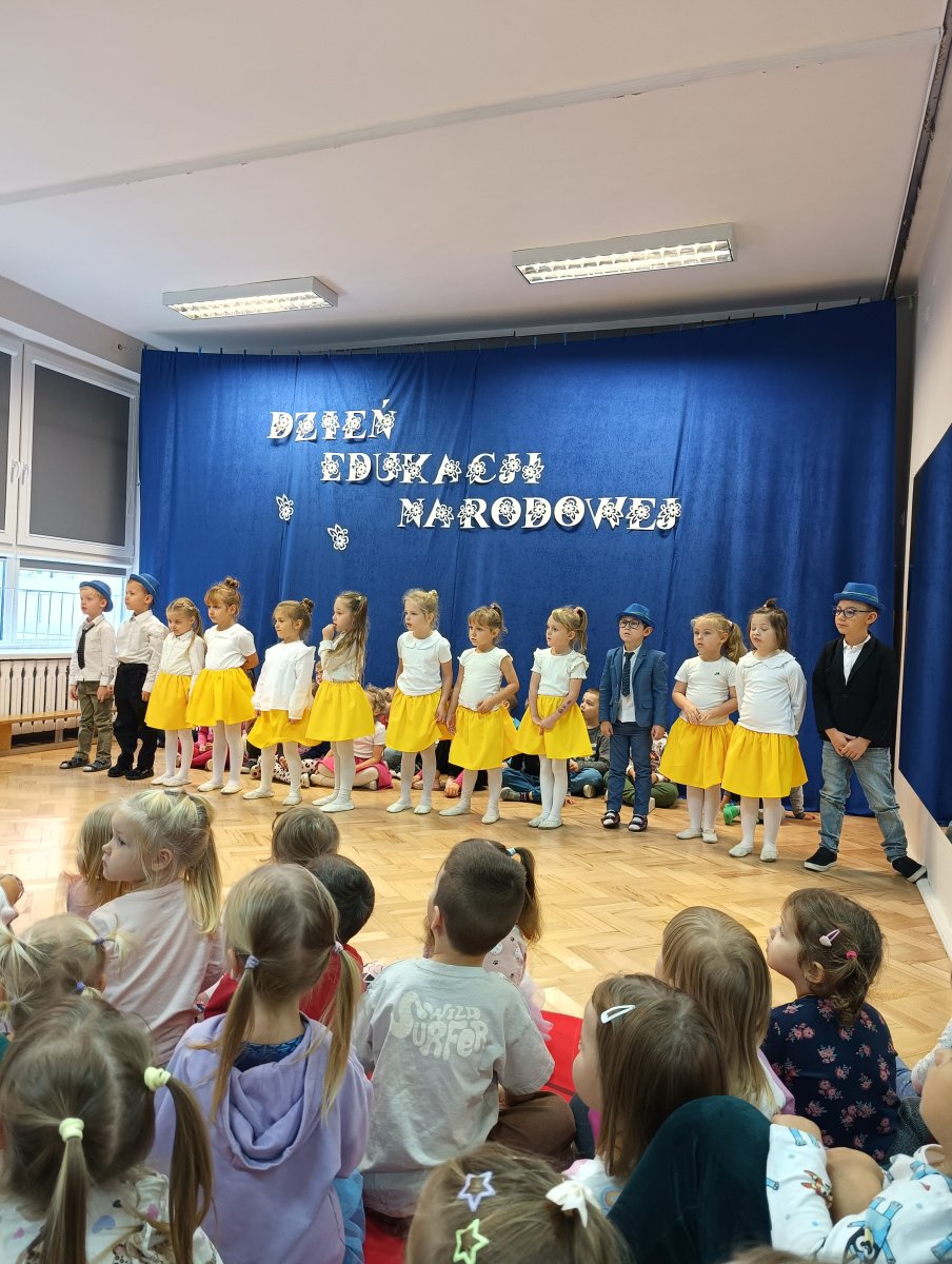 Dzień Edukacji Narodowej to szczególny dzień dla wszystkich pracowników naszego przedszkola, którzy w swojej codziennej pracy dbają by dzieci czuły się tutaj dobrze. Z tej okazji nasze przedszkolaki wraz z wychowawcami przygotowały specjalne występy artystyczne. Były piosenki, wierszyki oraz drobne upominki wykonane własnoręcznie. W ten sposób dzieci wyraziły swoją wdzięczność za troskę, cierpliwość i codzienny uśmiech. Dzień Edukacji Narodowej to również moment refleksji nad rolą przedszkola w rozwoju dziecka. Cieszymy się, że możemy wspólnie tworzyć miejsce pełne ciepła, zrozumienia i dobrej zabawy, które każdego dnia inspiruje do nauki i odkrywania świata.