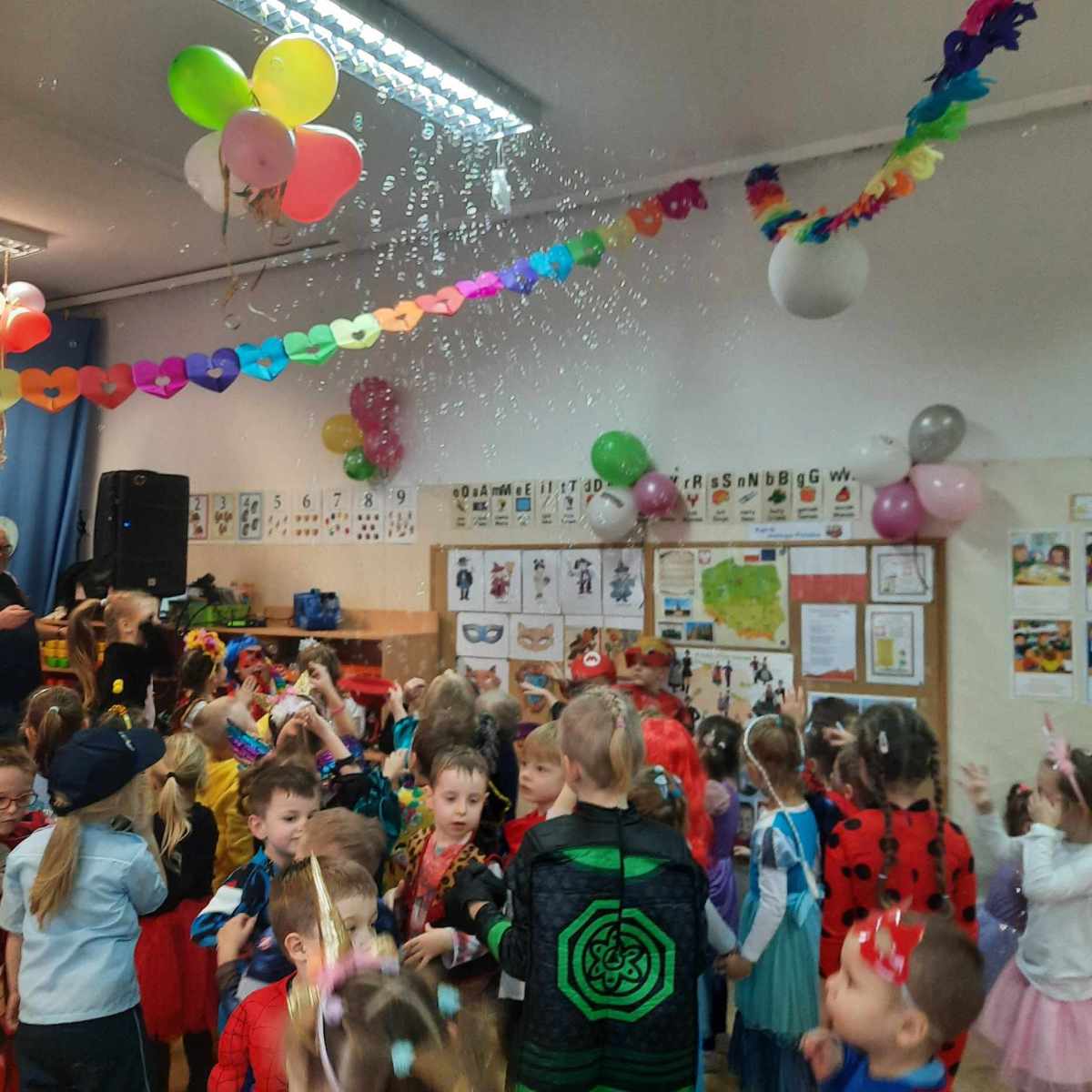 Bal karnawałowy dla przedszkolaków to dzień niezwykły, często wyczekiwany przez wiele tygodni. Jest atrakcją bardzo lubianą przez dzieci, dostarczającą im wielu przeżyć i radości. Tak też było u nas. 11 stycznia w naszym przedszkolu odbył się bal karnawałowy z prawdziwego zdarzenia! Tego dnia już od rana w przedszkolu pojawiały się kolorowe postacie. Przedszkolaki przebrane były za bohaterów z różnych bajek. W salach przedszkolnych można było spotkać między innymi: wróżki, królewny, rycerzy, piratów i policjantów. Rozpoznać dzieci było bardzo trudno. Wystrój sal wprowadził w radosny nastrój oraz zachęcał wszystkich do wesołej zabawy. Na tę wyjątkową okazję zaprosiliśmy wodzireja, który zachęcał nas do tańca. Kiedy pojawiły się pierwsze rytmy wesołej muzyki wszyscy z wielką ochotą rozpoczęli pląsy i tańce. Przedszkolacy bawili się znakomicie. Były „tańce – łamańce”, „pociąg”, „kaczuchy”, ,,krasnoludek” i inne . Jednym słowem zabawa na 102! Na sali podczas pląsów robiło się kolorowo, wszyscy bawili się wesoło, uśmiech nie znikał z twarzy mimo chwilowego zmęczenia. Punktem kulminacyjnym imprezy były bańki mydlane. Niestety, wszystko co dobre, szybko się kończy. Wspólna zabawa przyniosła dzieciom wiele zadowolenia i uśmiechu – czego dowodem są zdjęcia w galerii – zapraszamy do oglądania!