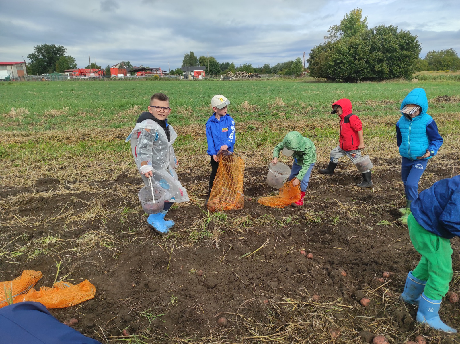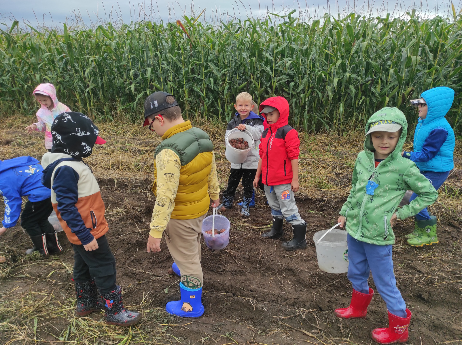 Dnia 15.09.2025 grupa Tygryski i Kubusie wybrały się na wycieczkę do gospodarstwa rolnego na wykopki. Na miejscu dzieci zobaczyły, jak wygląda praca na polu podczas zbioru ziemniaków. Poznały, skąd biorą się ziemniaki, jak rosną i jak są zbierane. Wspólnie z gospodarzami i opiekunami mali odkrywcy mogli własnoręcznie wykopywać ziemniaki z ziemi – była to świetna zabawa i nauka jednocześnie! Nie zabrakło też wizyty w zagrodzie ze zwierzętami oraz odpoczynku. Dzieci wróciły pełne wrażeń, uśmiechu i z nową wiedzą o życiu na wsi. To była wspaniała przygoda, która połączyła naukę z ruchem na świeżym powietrzu – dziękujemy gospodarzom za gościnność i ciepłe przyjęcie!